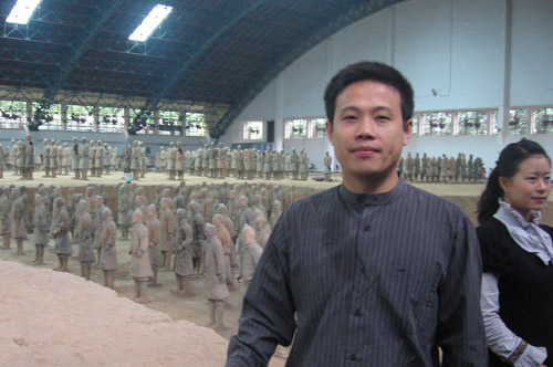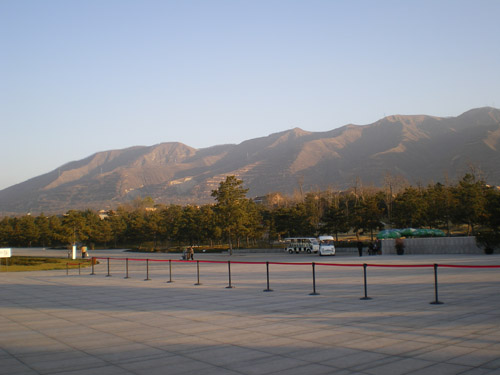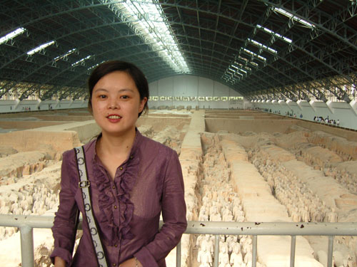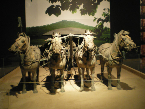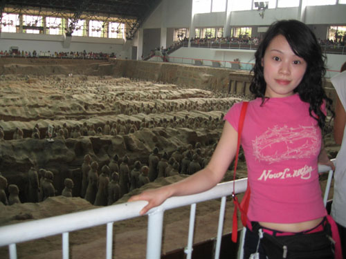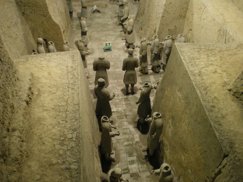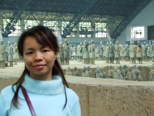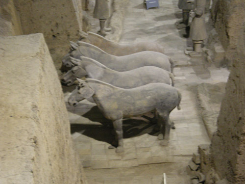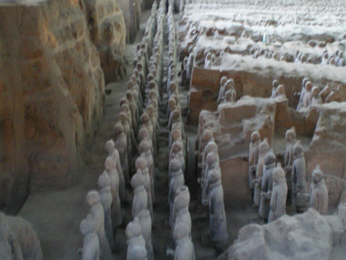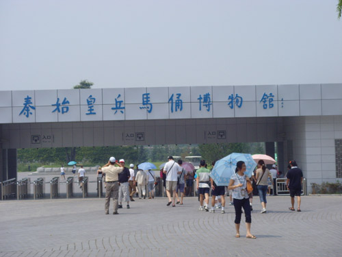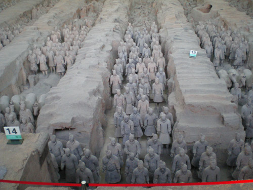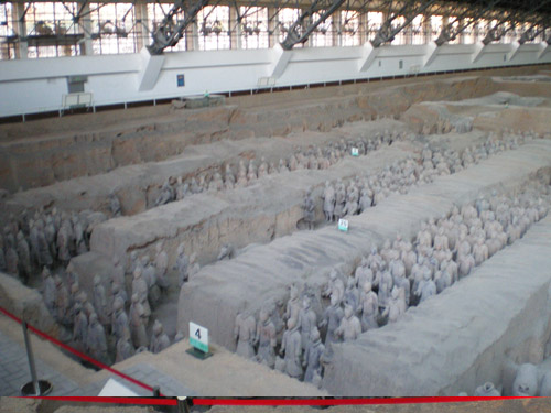 秦始皇是第一个统一中国的皇帝,他的陵墓在西安城东30公里处。1974年2月,当地农民在秦始皇陵东侧1.5公里处打井时偶然发现了与真人真马一样大小的兵马俑。从此,一个埋藏了两千多年的地下军阵被挖掘出来,并建成博物馆。秦兵马俑坑系秦始皇的陪葬坑,由一号、二号、三号坑和兵码俑坑组成。展出的陶质陪葬武士俑和兵马俑共计8000个,排列成阵,气势壮观。俑分将军俑、铠甲俑、跪射俑等。坑内还出土有数万件实战兵器,馆内展出秦始皇大型彩绘铜车马。被称为”世界第八大奇迹”’的秦兵马俑展示了古长安往日的辉煌,也是长安何已会成为丝路起点的一个写照。